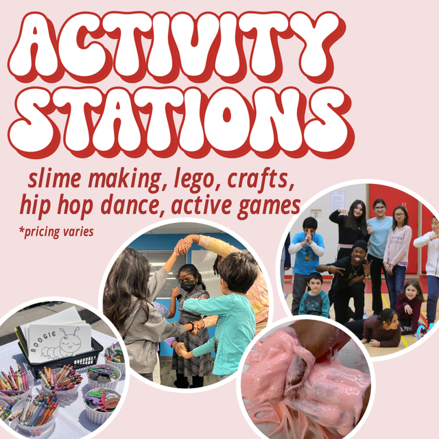 Additional services include Slime, LEGO Rentals, Active Games, Hip Hop Dance and Crafts.
