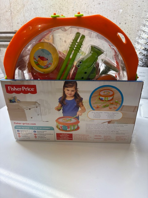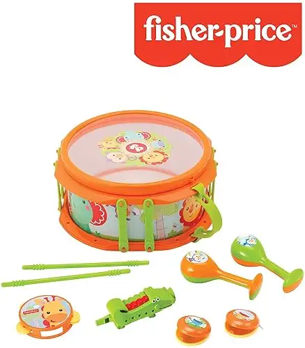 This 9 piece set includes a drum, two drum sticks, a recorder, a tambourine, two castanets, and two maraca.