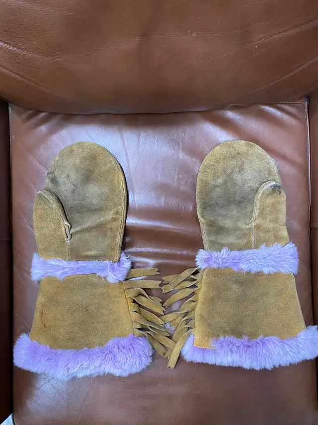 Authentic Indigenous Beaded Gauntlets from Northern Manitoba near Ilford. Possibly made by the War Lake First Nations. Beautiful bead work on tanned hide , with rare mauve / purple tipped rabbit fur accents. Tassels & felt lined . From the late 70's early 80's . Some signs of wear but overall great condition. $80.00. Phone or text 204-993-0227.