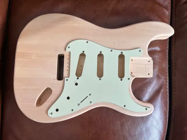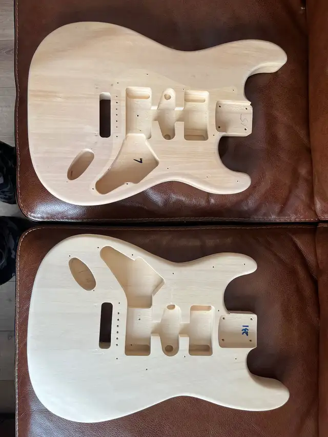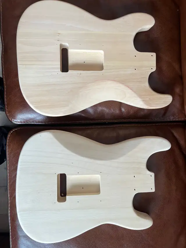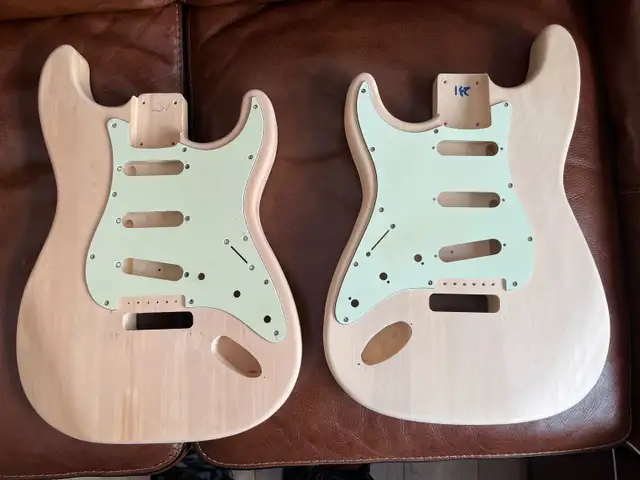 For sale, two Stratocaster style basswood Stratocaster bodies. One left and one right handed. Both come with a mint green Strat pickguard. Unused guitar kit projects. Great parts for partscaster projects. $100 each. $200 for both. Text or calls are best at 204-792-1485