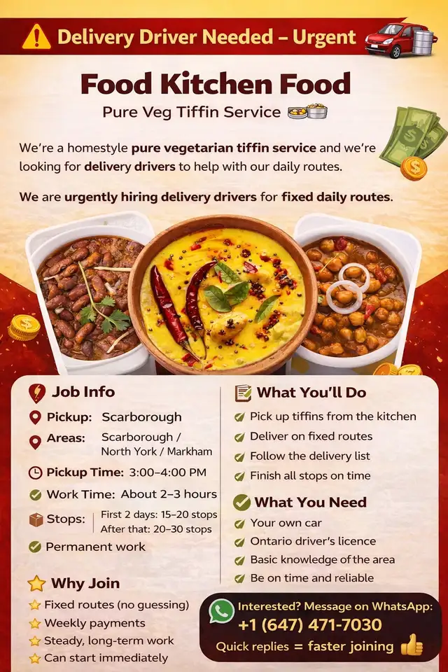 We're a homestyle pure vegetarian tiffin service and we're looking for delivery drivers to help with our daily routes.