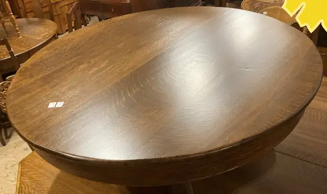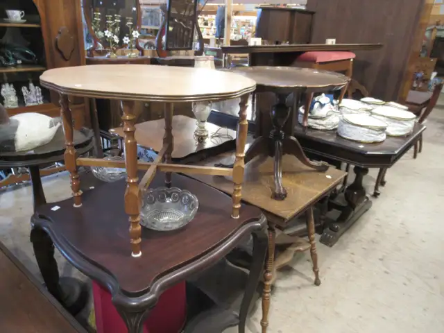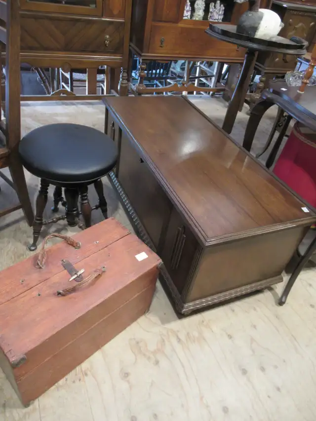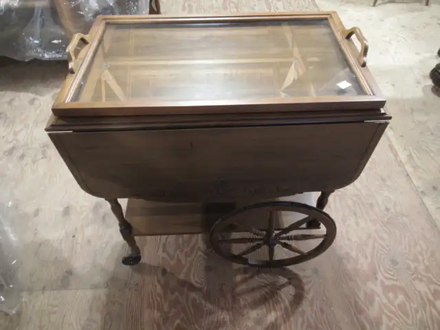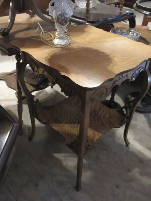 REFINISHED 44" round kitchen oak table cut down to use a a coffee table. The coffee table is priced at $550. We also have a section of side tables, parlor tables, tea wagons, cedar chests etc. Or maybe you have a table that you want to cut down, we can do it.