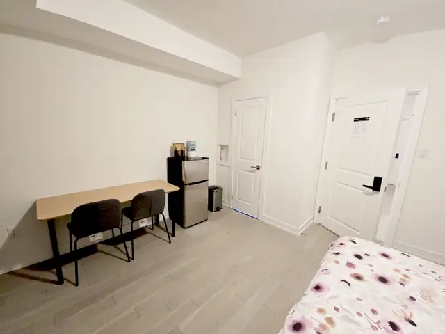 Daily or weekly Room all fully furnished with a fridge with free soft drink and water bottles, a desk, chairs, in unit laundry, WIFI, heat and AC.