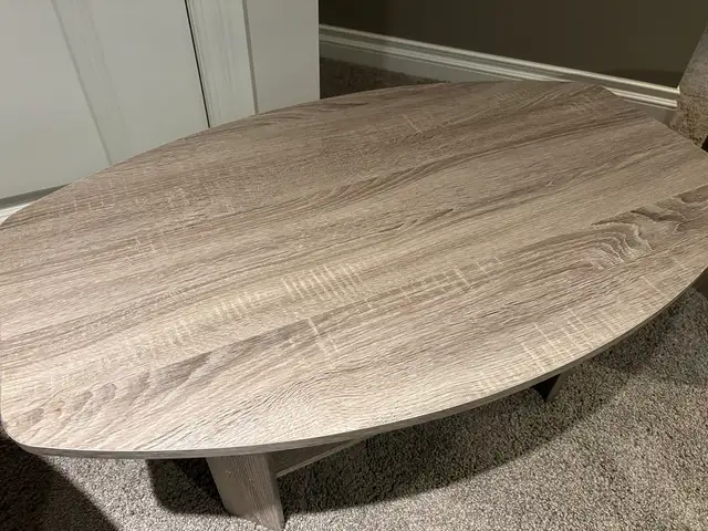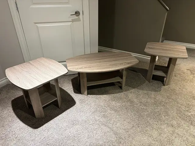 Tables are all in really good shape, no stains or scratches I could see. Side tables are 19.5" high, coffee table is 16" high. Side table are 20" x 20" and the coffee table is 35 1/2" x 21 1/2". They are engineered wood with laminate surface. The come from a smoke free/pet free home. $100. call or text 431-554-4196