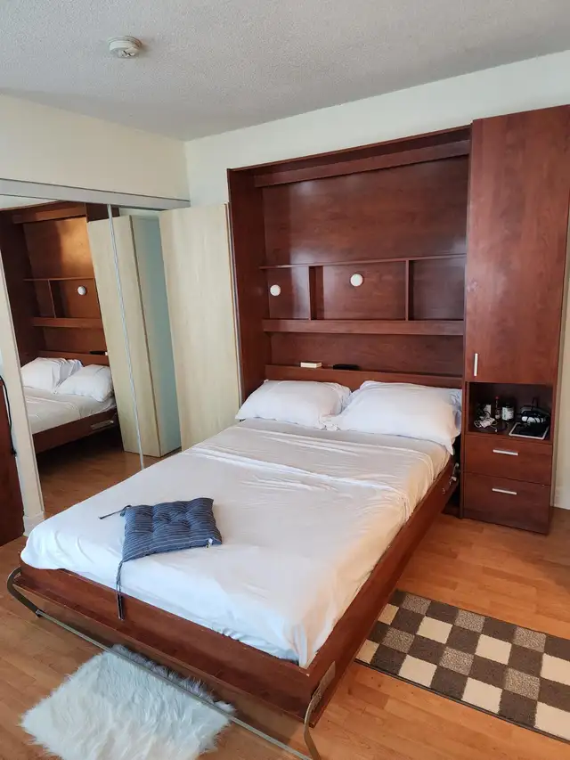 Window coverings, Murphy bed, tv, stove, dishwasher, washer, dryer, microwave, couch, dining set, fireplace, balcony, exclusive gym facilities, 24/7 security.