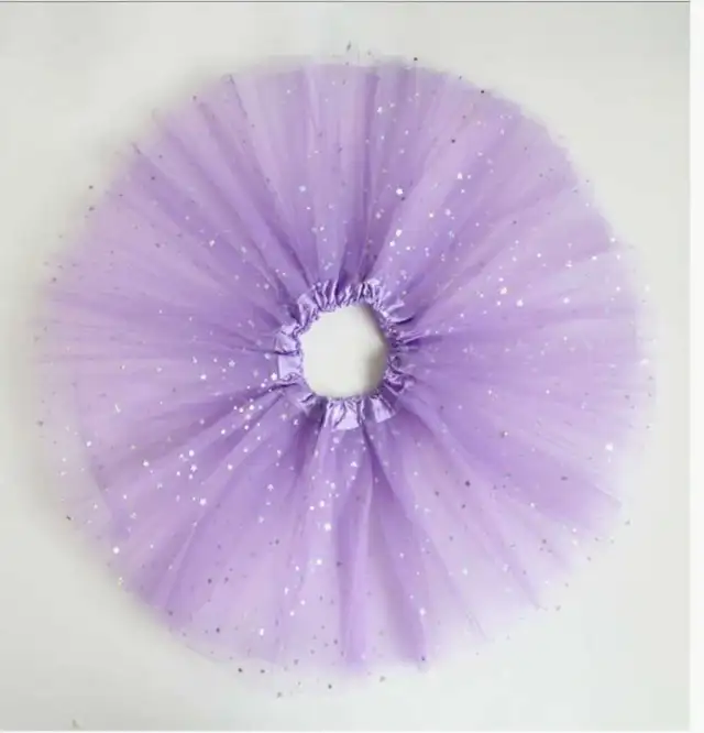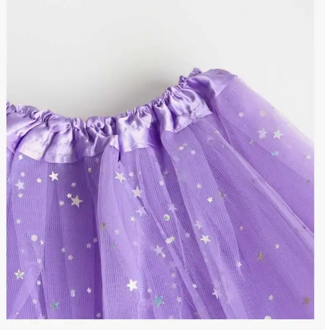 Surface layer has shiny stars sequins, sparkly. 3 layers semi-sheer tulle, full and fluffy tutu, satin covered elastic waistline comfy for girls to wear