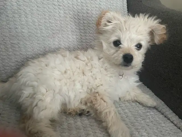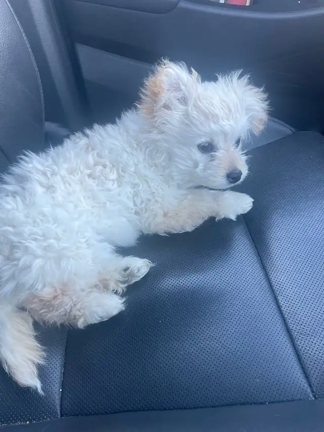 Loveable 4 month old bichon/ Pomeranian. Have to rehome her as our landlord will not allow us to keep her, which is very saddening for me. She has her first shots. She's quiet, full of life, cuddly and fun. She is pee pad trained and starting to Lear to go out side. Dm me or contact me at 204-674-5313