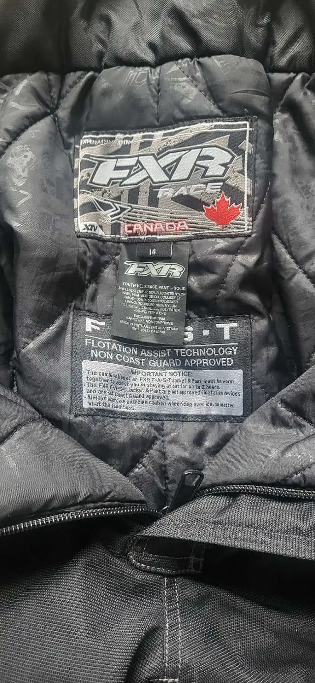 FXR size 14 youth pants. These pants are very lightly worn. Almost like new. Have flotation assist technology. Very warm. Contact Darrell at 204-510-2234