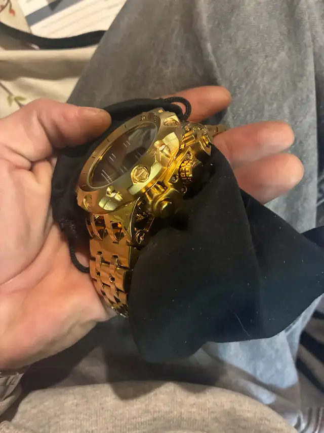 Selling an Invicta style Zeus Bolt 52mm all gold men's watch with fully functional 3 eyes; a 24 hour clock, minutes and seconds timer, and a calendar date position between the 4 and 5 o clock position. The watch is brand new. Comes with extra links and mini tool