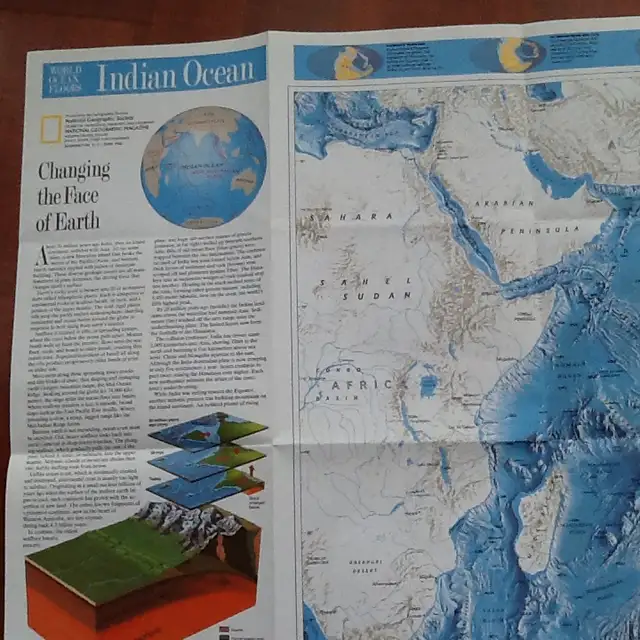 One side reflects the physical map of the Pacific Ocean floor and contains an article entitled "Deep-Sea Vents: Worlds Without Sun" and additional information on the life forms that thrive in the deepest waters of the Pacific.