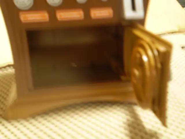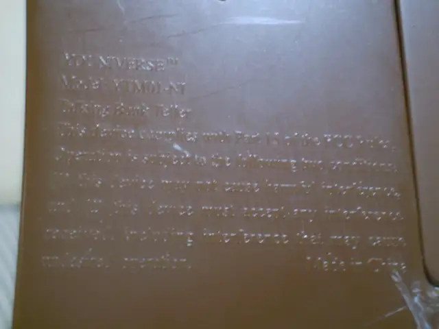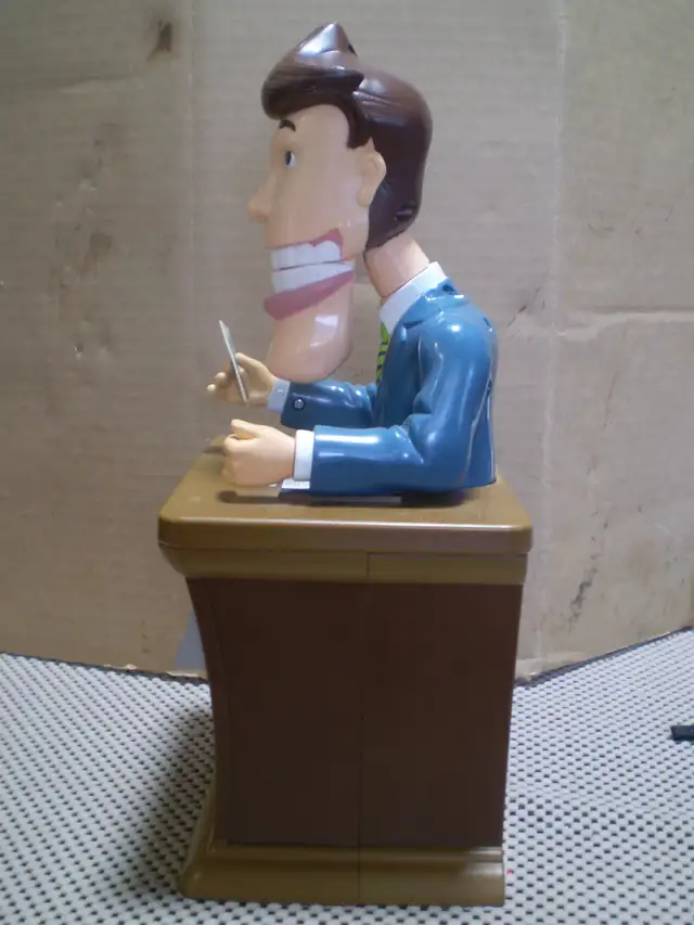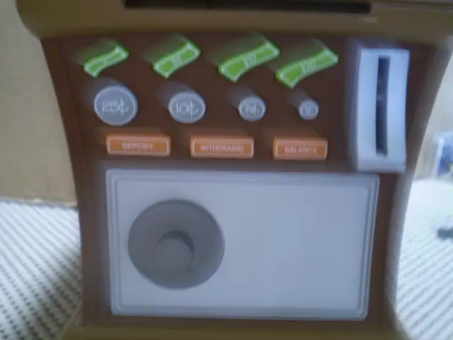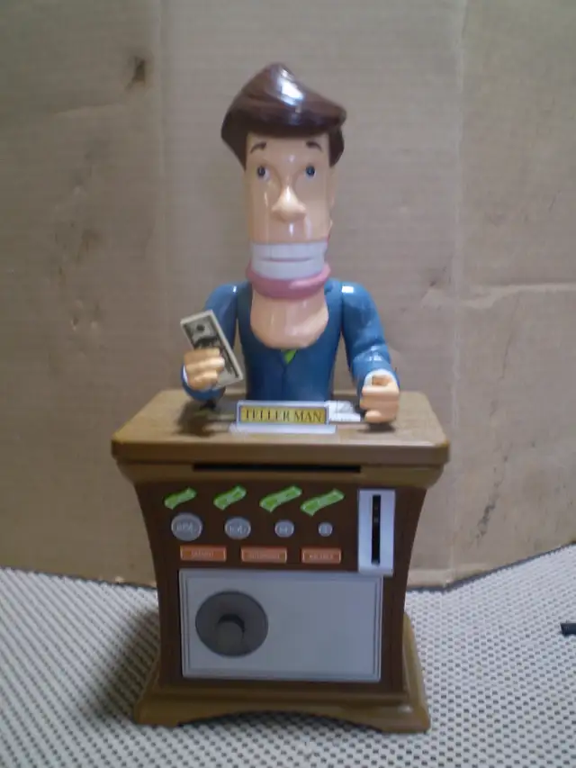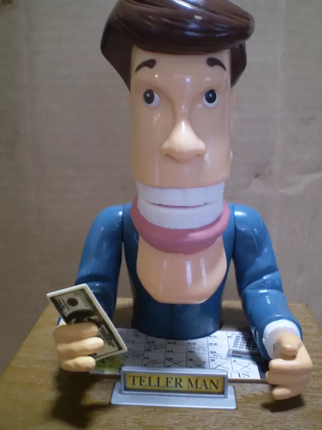 Dated 2006. All plastic talking TELLER bank. Accepts coins and bills. Manually enter amount with push-buttons and whether deposit or withdrawal. TELLER figure will respond with varying remarks. Gives a balance as well if selected..TELLER's jaw moves when talking, arms and head move as well. Combination lock allows owner access to funds. Uses 4 AA batteries, Some battery contact corrosion that has been treated and works. Batteries included. 13 inches tall, 6 inches square base.