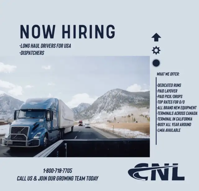 CNL is looking for experienced Class 1 drivers to join our professional team! If you're a reliable, motivated, and safety-conscious driver with a passion for the road, we want to hear from you! * APPLICATION PROCESS IS ALL VIA EMAIL / PHONE CALL ROAD TEST IS TAKEN ONCE ALL PAPERWORK IS SUBMITTED * What We Offer: Competitive pay Flexible schedules with full-time hours Modern, well-maintained equipment Safe and supportive working environment Opportunities for long-term career growth Job Requirements: Valid Class 1 driver's license Minimum 2 years of driving experience Experience with manual Transmission Mountain and winter driving experience Clean driver's abstract Ability to adhere to safety standards Strong work ethic and professional attitude Job Duties: Safely transport goods in a timely manner Mix of Dry & Reefer freight mostly dry Complete pre- and post-trip inspections Communicate effectively with dispatch and team Follow all company and road safety protocols How to Apply: If you're ready to hit the road with a growing and respected company, apply today! Contact Information: Phone: 1-800-718-7705 Email: DISPATCH@CNLGOC.COM Join C.N.L and be part of a team that values its drivers!