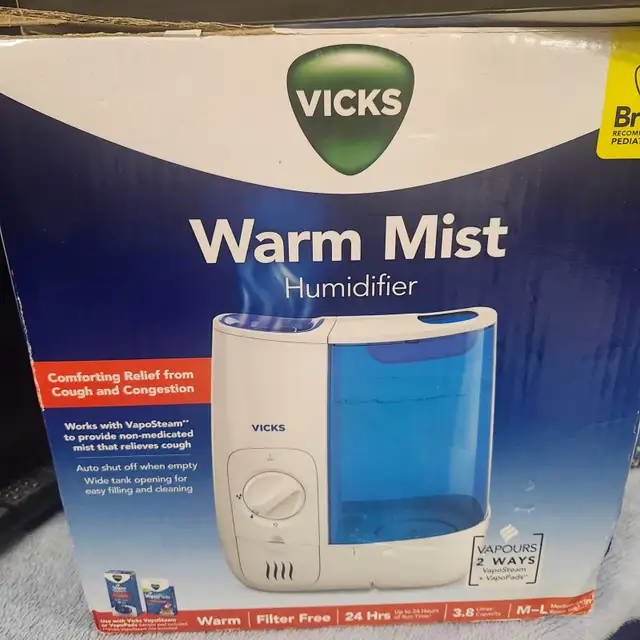 Up for sale is a like new in the original box Vicks Warm Mist Humidifier with Auto Shut-Off, 1 Gallon, Model V745A