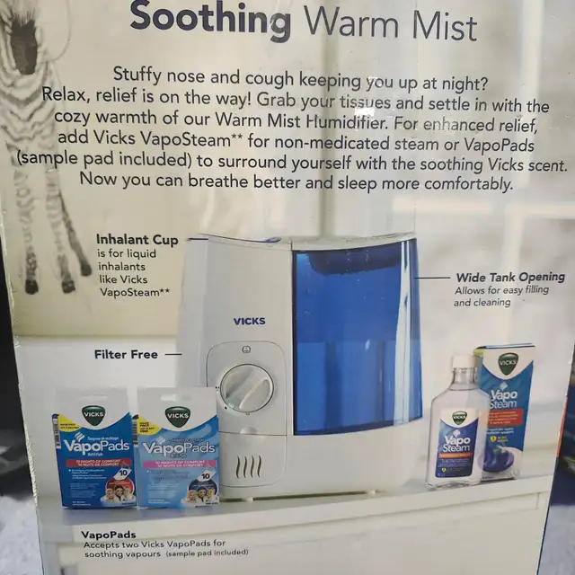 Vicks Pure Warm Mist Humidifier for Relief of Cold & Flu Symptoms. This humidifier boils water to a pure steam vapor up to 96% bacteria free. This mixes with dry air in the cooling chamber to release warm, moist air into the room.