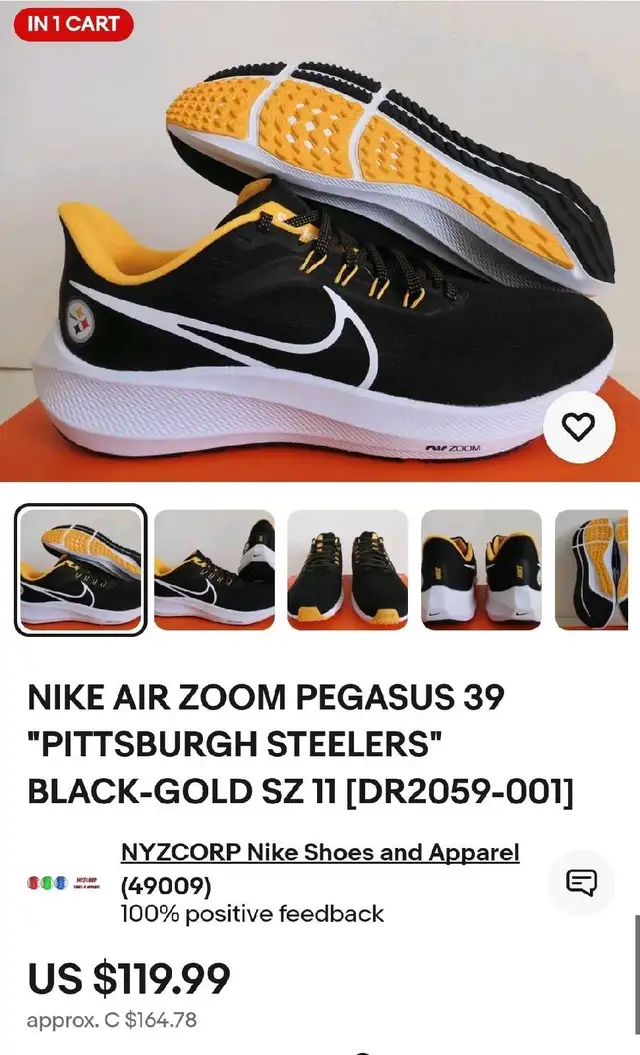Selling my Nike Air Zoom Pegasus 39 Pittsburg Steelers Black and Gold size 11.5 shoes. I have worn them a couple of times. I don't have the box anymore but I purchased it online from Lids.