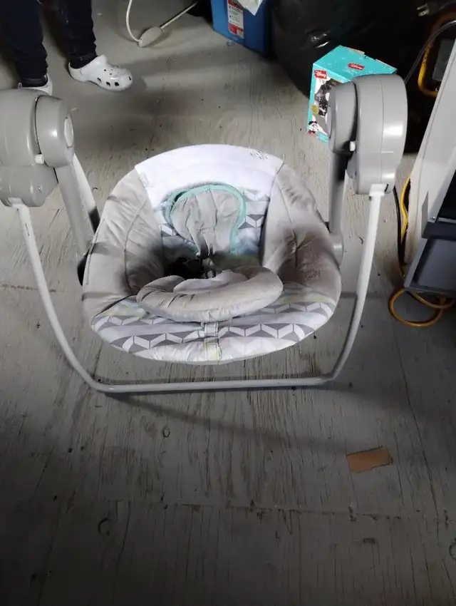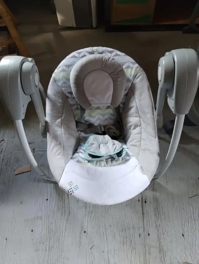 Ingenuity Comfort Go Portable Automatic Bay Swing Foldable Mini Swing Easy to Transport, Plays Soothing Music, Plush Swing Cushions Entertain Your Baby Extra Quiet Automatic Swing for More Peaceful Moments Automatically Turns Off after 30 minutes. Price $15.00. Call 403.226.3222.