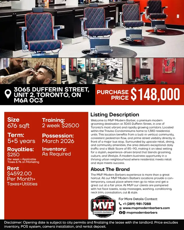 MVP Modern Barbers presents a turnkey opportunity to own a premium modern barbershop in one of Toronto's fastest-growing neighborhoods.