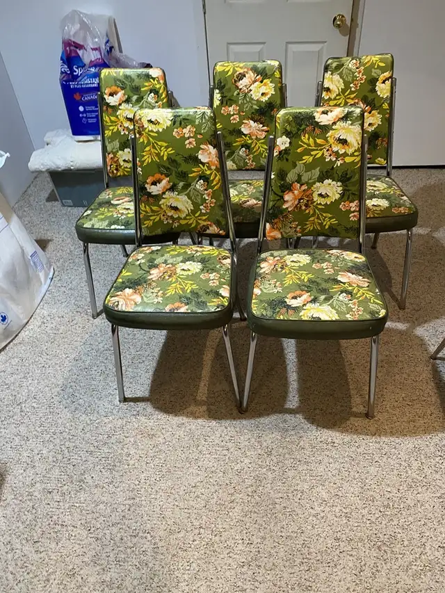Vintage 1972 white & green Arborite top. 5 chairs in excellent condition. Measures 35 1/2”W by 47 1/2”L with table extension. $199. This comes from a pet free/smoke free home. I'm posting this ad for my aunt; they are downsizing. You need to call her directly at 204-805-5558