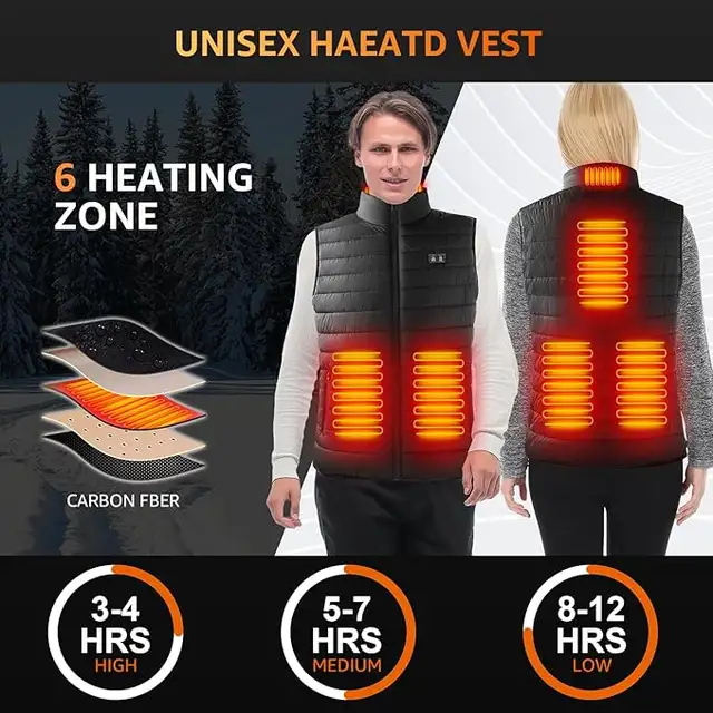 【Intelligent Temperature Control】 This heated vest for men and women adopts the latest heating system and technology. Equipped with six high-quality TPU heating panels, it warms up in just 3 seconds, providing heat to four key body areas — the neck, back, waist, and abdomen — to keep you warm throughout the cold winter. With just one button, you can easily switch between three temperature settings (40°C/104°F to 60°C/150°F). Press and hold for 3 seconds to power on, and short press to change the temperature mode.