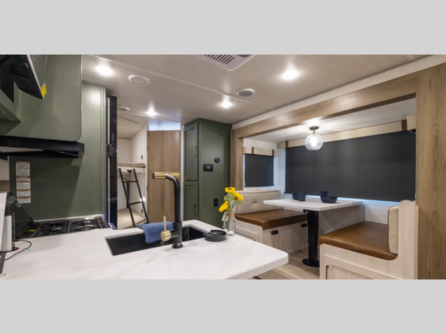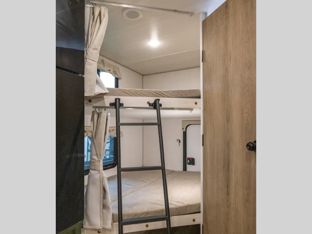 Pack up this very versatile Murphy bed travel trailer and head out to explore! You will love the space saving aspect that a Murphy bed gives you by not increasing the tow length in order to give you a separate bedroom and living space, and you don't even have to make the bed, just fold it up into the wall in the morning! Double-size bunks in the rear corner are perfect for accommodating both children and adults. The kitchen offers everything a cook would need to feed the whole gang and there is even a counter bar area with two stools which will be perfect for breakfast time. There is a booth dinette slide for more dining space, or a place to enjoy a board game or card game when you are inside. When the optional Beast Mode Package on this model is chosen, you'll enjoy a 400-watt solar package, a fresh water filter, a Maxxair roof vent cover, plus a Beast Mode independent suspension for better handling.