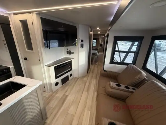 With any Wildwood Heritage Glen travel trailer by Forest River, the quality construction, attention to detail and design along with a bright and welcoming interior allows you to relax in comfort. Each model includes a WeatherShield one piece fiberglass roof, nitrogen-filled radial tires, and an enclosed underbelly with 12V tank heaters on all holding tanks for added protection. You will appreciate the on-demand tankless water heater, along with power stabilizer and tongue jacks, and an extra-large pass-thru storage with slam latch baggage doors. Head inside to enjoy matte gold hardware, wood door casings in place of plastic door casings, and an ultimate interior lighting upgrade with 4k puck/strip lights and a stylish LED back-lit bath mirror!