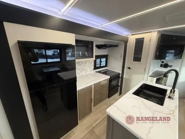 Your kids or friends are ready for a trip in this Wildwood Heritage Glen travel trailer, but are you? As the kiddos or your buddies claim the private bunkhouse for themselves, which includes two bunk beds and a convertible sofa bed, you can escape to your own privacy in the front bedroom with a queen bed and lots of storage. There is even washer/dryer prep for added convenience. The main living area and kitchen might be the next indoor hangout spot thanks to the chef-size walk-in pantry and 12V refrigerator. The cook even has a choice of making meals on the outside kitchen/bar which also includes an LP quick connect nearby. On rainy days, the theatre seats and booth dinette will offer a place to watch TV and play games, and the panoramic windows will always offer beautiful scenery no matter the weather conditions.