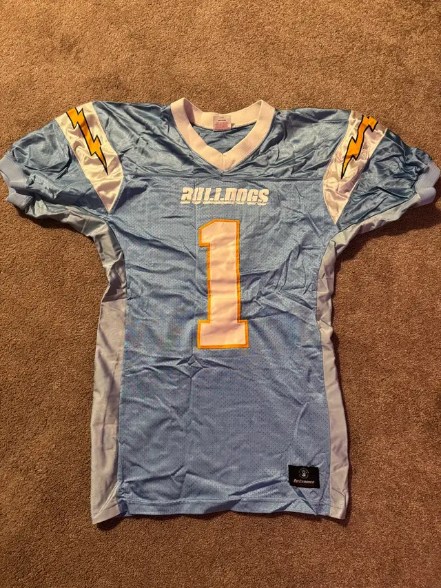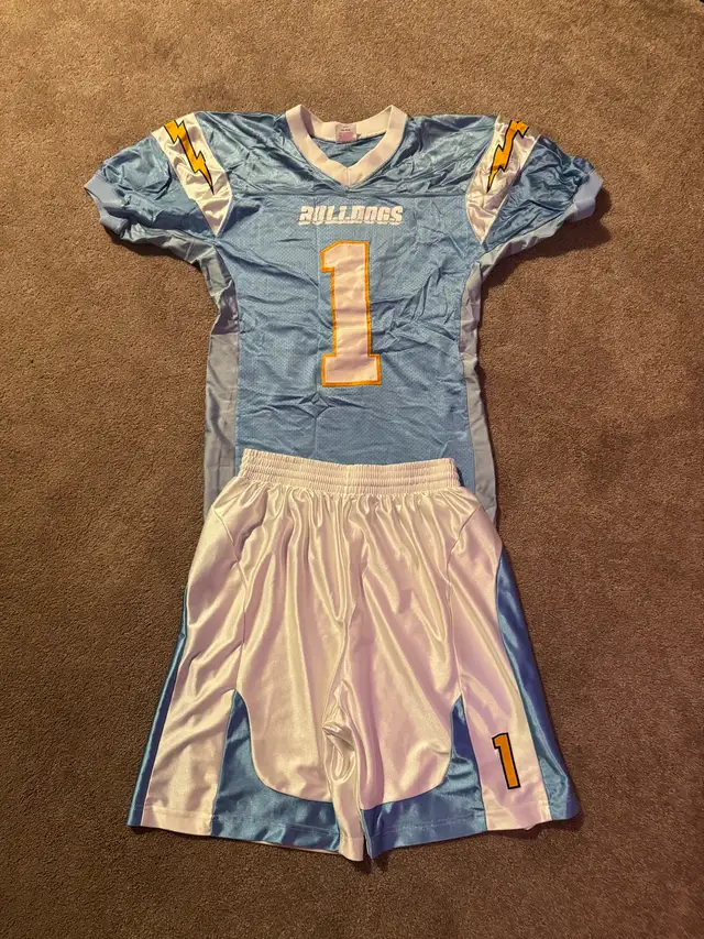 This used but well maintained jersey and shorts set is perfect for Football, Basketball, Soccer Etc. The set includes a light blue jersey San Diego Chargers Style with the number and matching shorts with the number. These are all in great condition and ready for the next game or practice.