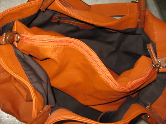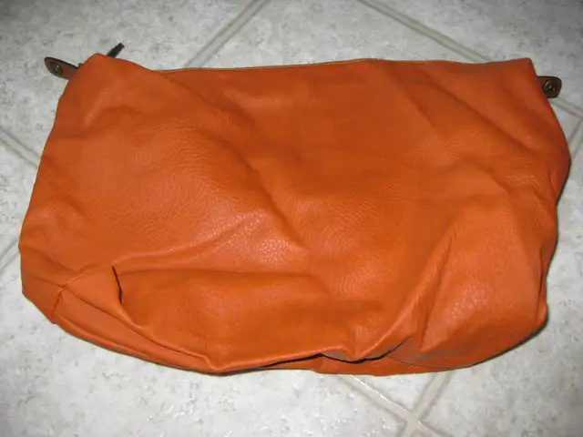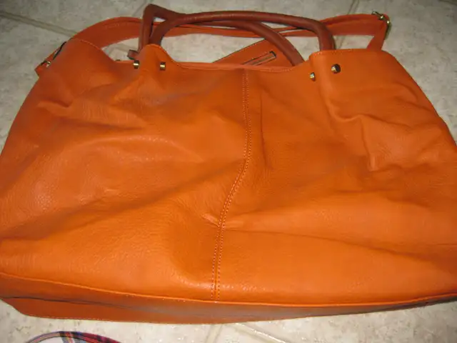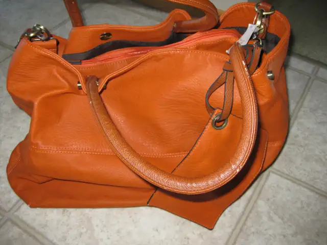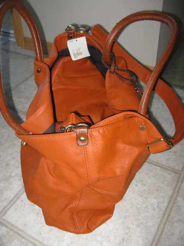 Brand new, tags still on multifunctional tote bag. Burnt orange colored with cognac colored handles and burnished gold hardware. Bag features detachable/adjustable shoulder strap. Detachable, zippered large inner pouch. Detachable small, zippered side pouch. Inside bag are also several compartment and one that is zippered. Bag can be used with out without the larger zipper pouch as bag still has pouches inside that are zippered. Main bag also has a snap closure. Measurements not including handles for the tote itself are: 12" height; 16" length; 5 1/2" width. Pouch measurement: 11" height; 15 1/2" length; 5" width.