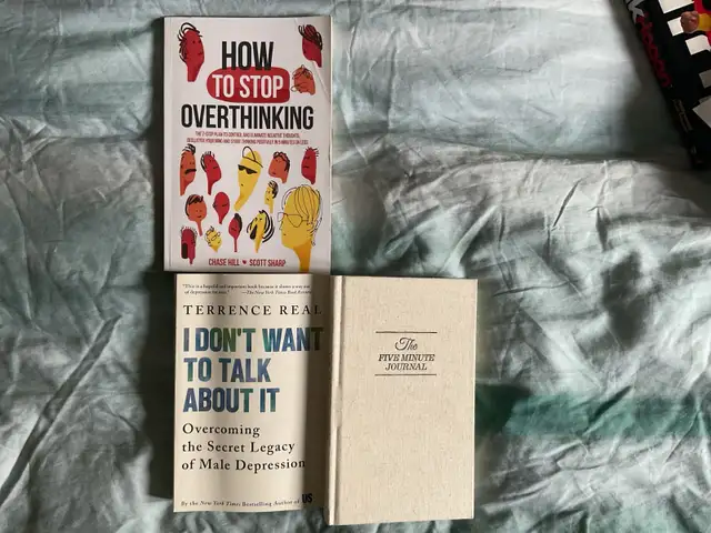 This collection includes 'How to Stop Overthinking' by Chase Hill and Scott Sharp, 'I Don't Want to Talk About It' by Terrence Real, and 'The Five Minute Journal,' offering strategies for mental wellness and personal growth. The books are used but in good condition, ready to inspire and assist someone on their journey to a clearer and more mindful life. The journal is Brand new.