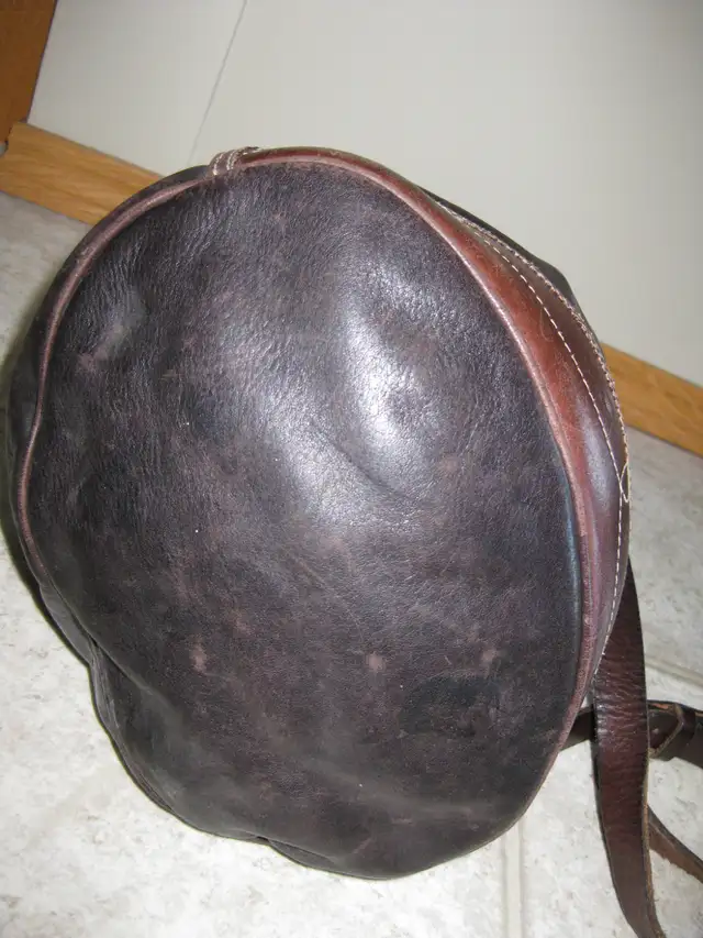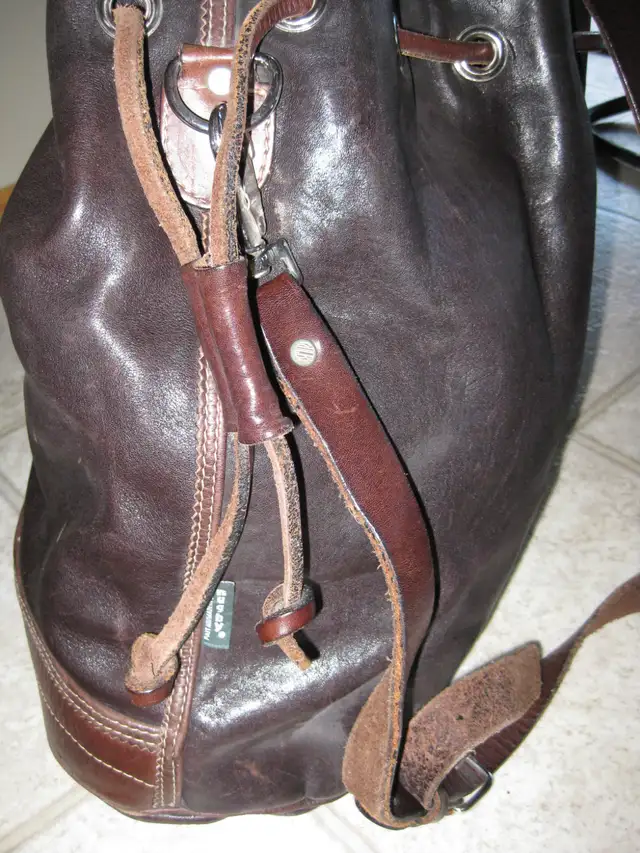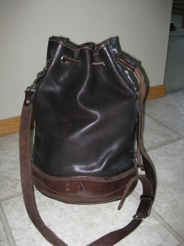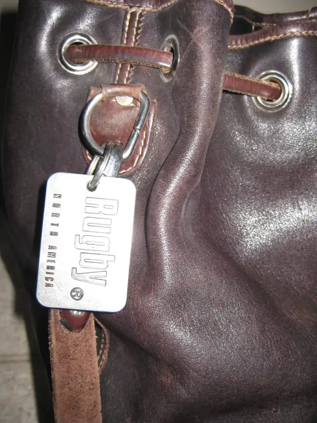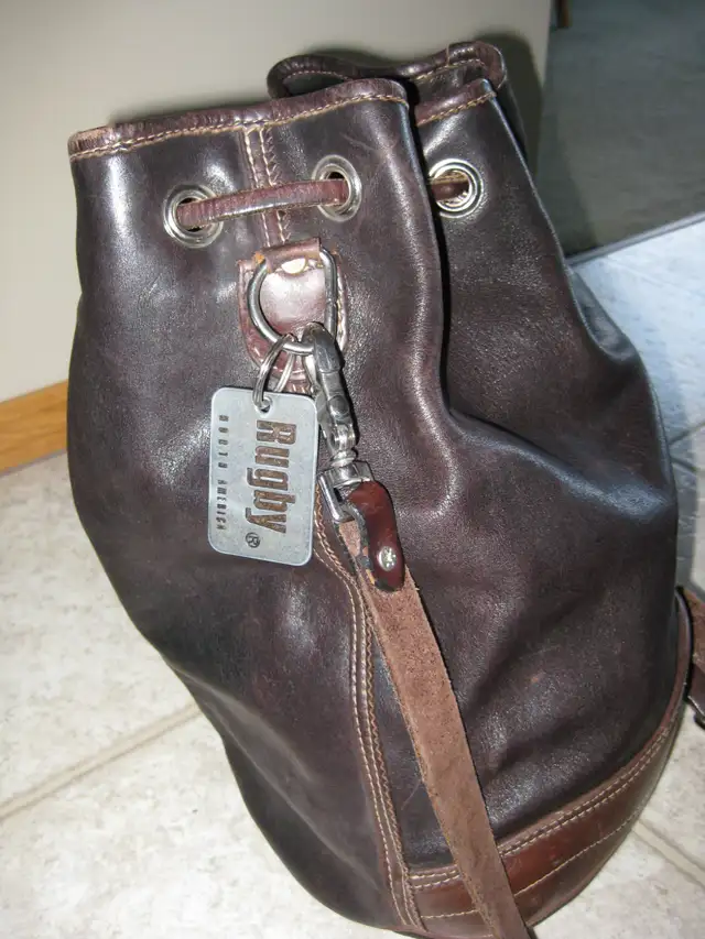Vintage Rugby North America Leather Bucket Bag. Espresso brown and dark brown colored leather with silver hardware. Made of excellent durable grained leather. Rugby North America is previous company name of M0851 known for their quality and sturdy construction These models are no longer produced. Unique everyday carry all. Made in Canada. Removeable/adjustable shoulder strap. Winched leather rope closure. Measurements of the bucket itself, not including the strap approx: 15" height; 12" length. Great condition. $125. Call or text 204-391-2502.