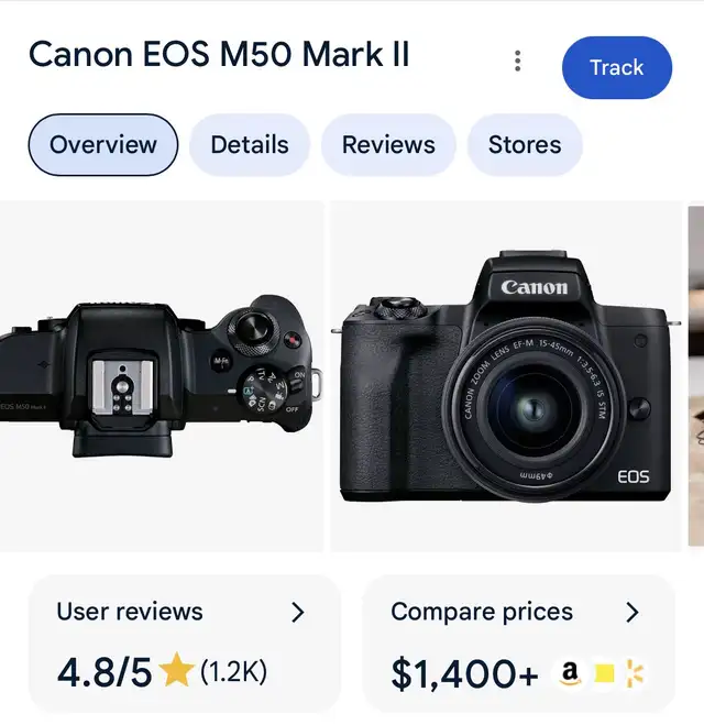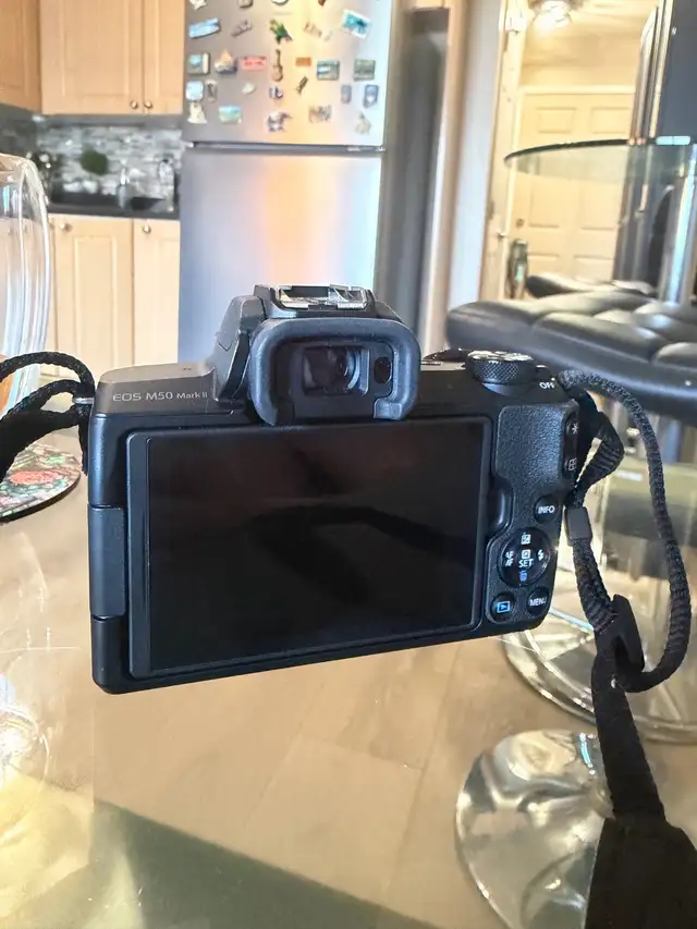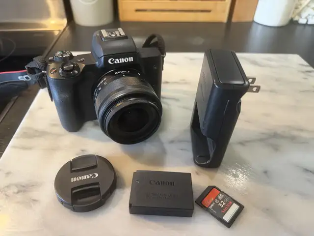 Canon EOS M50 Markll with 15-45mm lens, lens cover, Battery, charger, 32G memory card. Mint condition asking $1,050 o.b.o. Currently retails for $1,400. Mirrorless SLR with Bluetooth for easy transfer excellent camera. Please text or call 780-710-7009