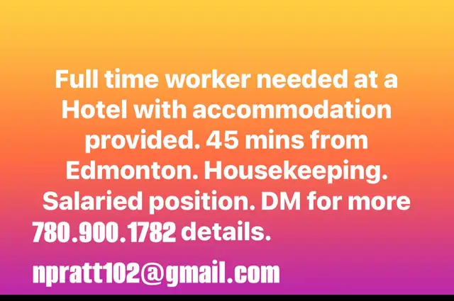Full time Hotel Job with accommodation Full time job at a motel with accomodation for more details. Contact for more details and send your resume to npratt102@gmail.com