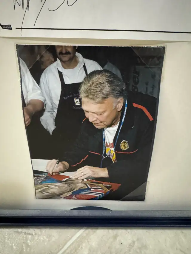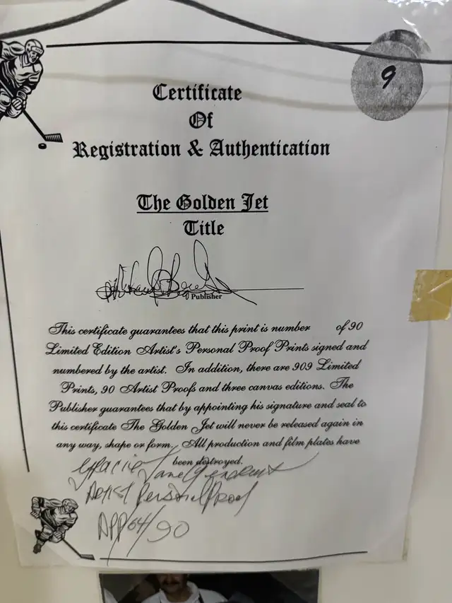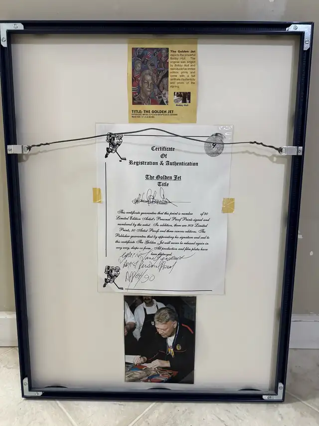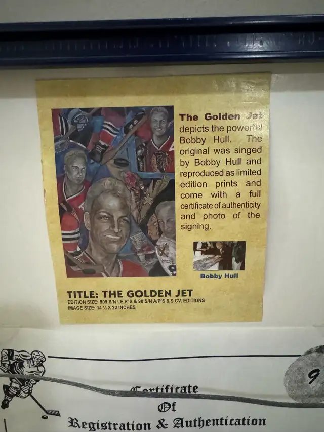 Own a piece of hockey history with this framed, limited edition (AP/6/90) Bobby Hull "The Golden Jet" print! This striking piece captures the essence of the legendary Chicago Blackhawks player, making it a must-have for any serious sports memorabilia collector. The print comes with a certificate of registration and authentication and a photo of Bobby Hull signing prints. It is in great condition and ready to display.