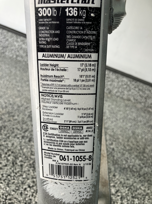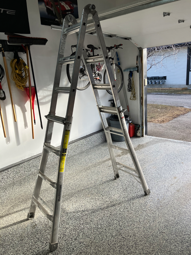Mastercraft #061-1055-8 multi task ladder. Use as step ladder or extension ladder.Great on stairs 17' reach. $300 new at Canadian Tire will sell for $150 obo ' Pick up in airdrieNorm 403-874-7691