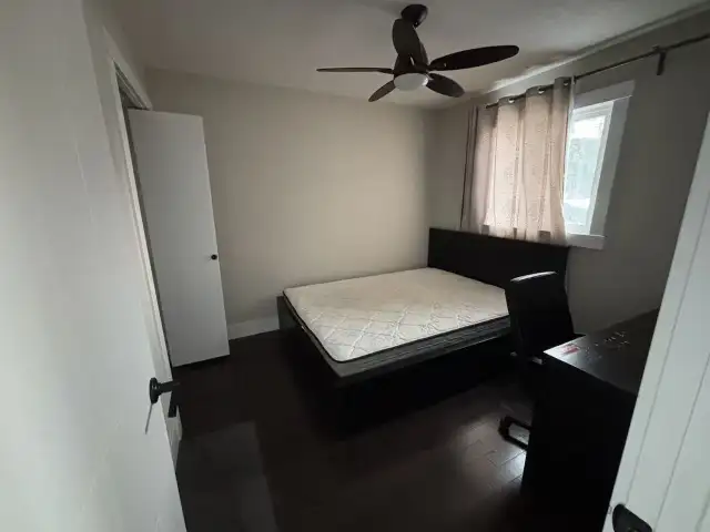 Everything must go. four desks, three queen-size beds with mattresses, one twin-size bed with mattress, and one sofa.