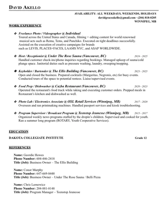 If you got some work available and need an easygoing hard worker — I can be reached at 204-818-0205 by call or text, or via email at davidgraceakello@gmail.com.