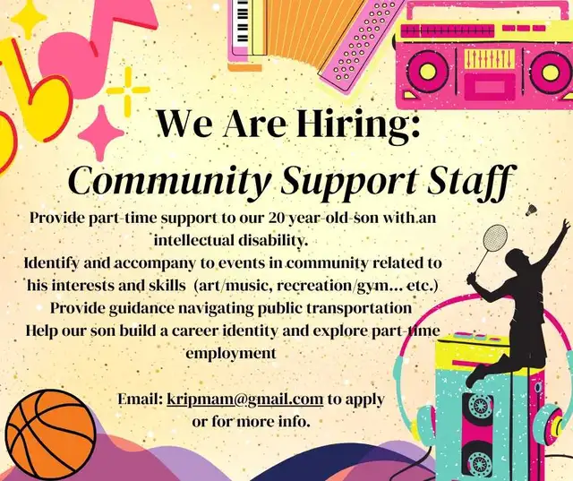 We are looking for an outgoing, community‑minded person to support our 20‑year‑old son, who has an intellectual disability. This role involves helping him explore his interests in art, music, and sports; attending weekly vocational training; building friendships; and participating in community life. The facilitator will also support him in exploring part‑time employment opportunities. An interest in music and activities like basketball or badminton is an asset.