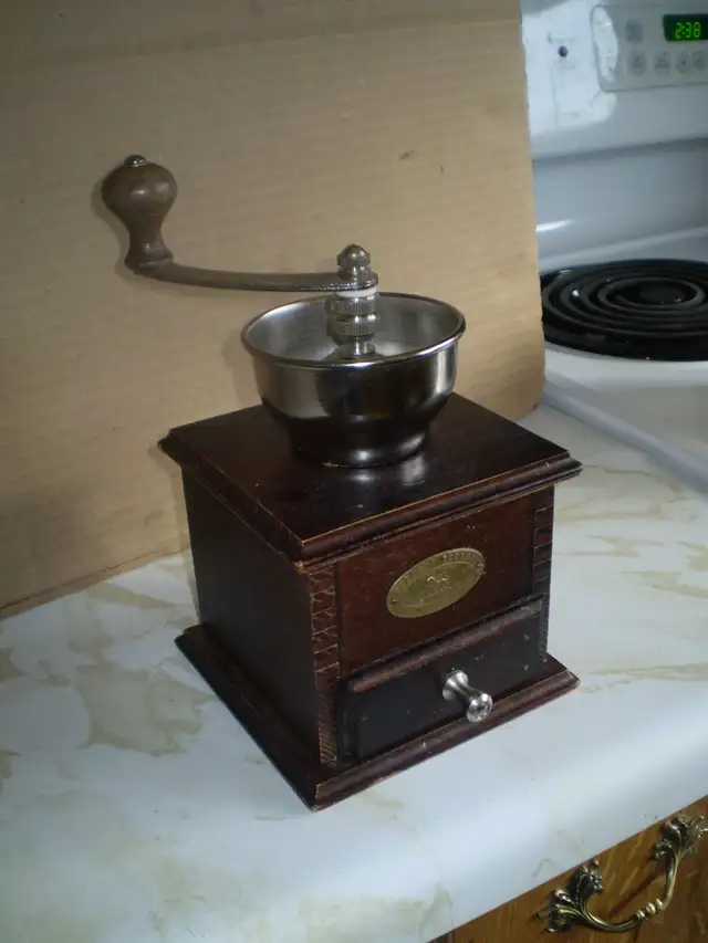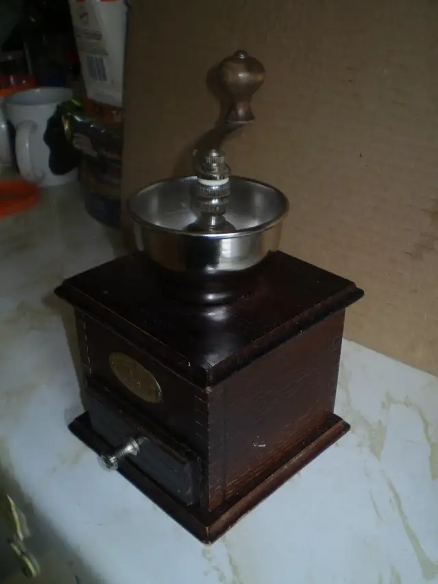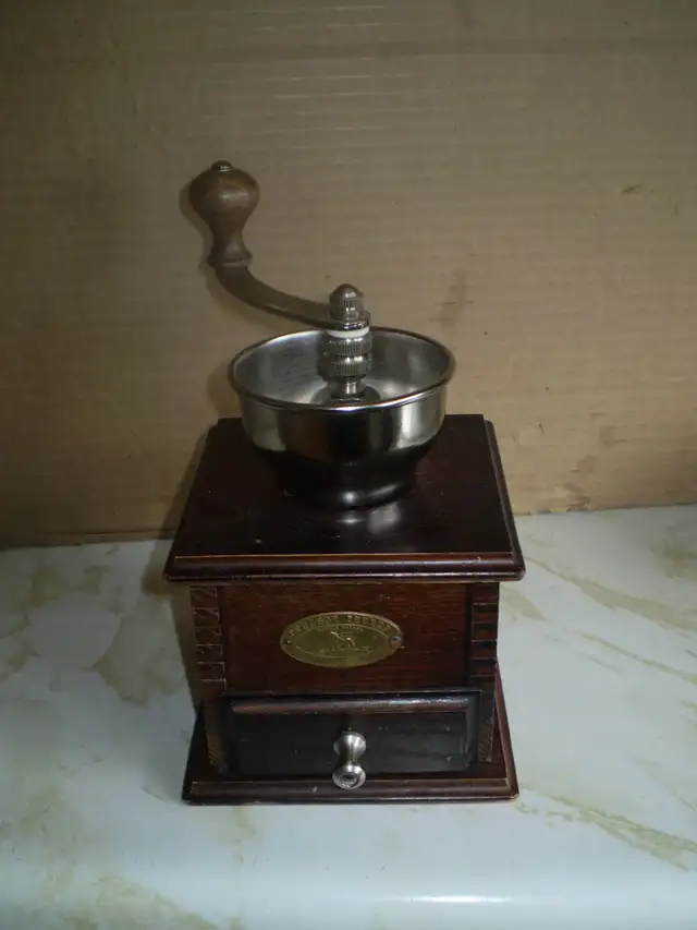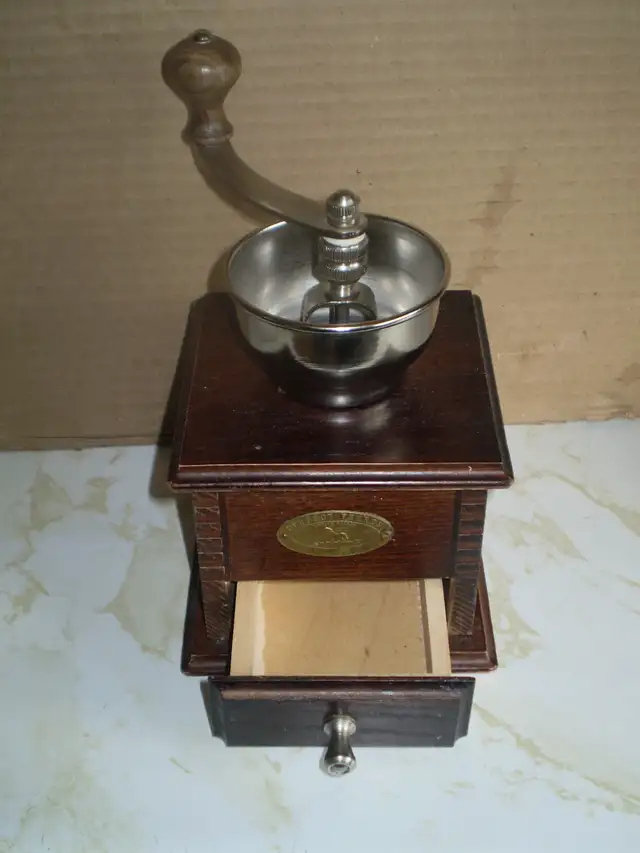 Manual grinder for coffee or spices. No sign of use. Wood body with small wood drawer to collect what has been ground. Manual adjustment for coarse or fine grind. Dark stained wood with oval brass label on front "PEUGEOT FRERS" MODEL DEPOSE with a long tailed Lion on arrow trademark. Drawer can be removed. Tension bar on side of body to keep collection drawer from moving. Wood base 5" X 5" and unit is 9 inches tall to top of grinding lever wood knob. This Reproduction of an antique coffee mill lists for over $200.
