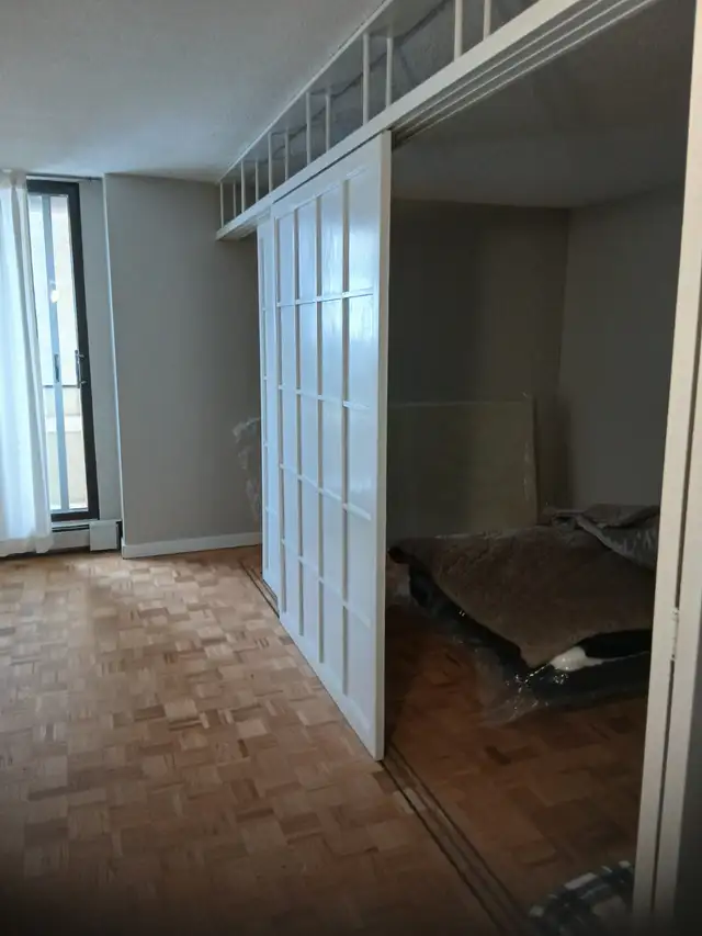 450 ft studio with large balcony. Rent is $1,242 and it includes one Underground parking, all utilities, pool, sauna, Fitness Center. Very close to amenities and buses. 10 minutes or less from airport. This is a very secure building with underground access to mini mall . Call immediately 905-865-8595. Leaving here in 6 days