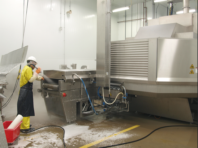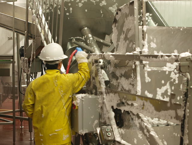 • Washing, scrubbing, and sanitizing food processing equipment and machinery