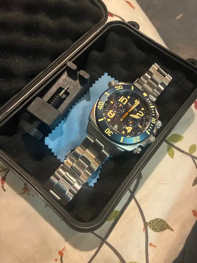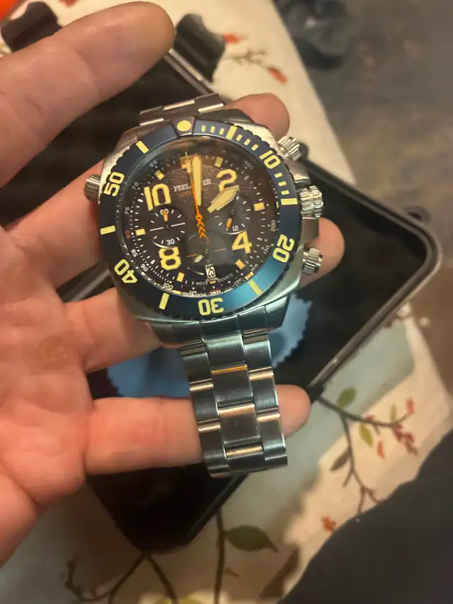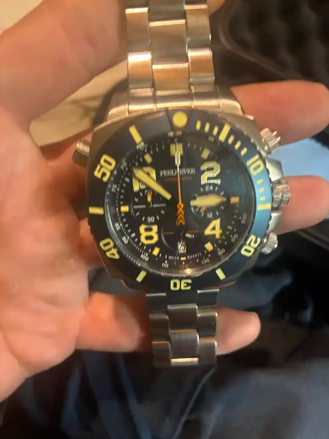 This watch features a 120 click one directional bezel that is easy to utilize and has no wiggle or side to side play unlike other dive watches that has a diving bezel for ornamental purposes but not functional or accurate like a true diving bezel as this one is. Features a domed anti reflective, anti scratch sapphire crystal. All brushed stainless steel. The watch face is features 3 eye window and a date window at the 6 ‘O clock position. Sub dials have 24hour, seconds, and minutes when using the chronograph. The Chronograph utilizes the main red, or large second hand as a sweeping hand chronograph while the seconds hand while the seconds in the subdial is for the seconds movement for the actual time keeping along with the main large hands of the watch. All buttons work and screw down to ensure a water tight seal when diving. Also has a screw down helium valve. For what you're getting the watch is very high quality. Comes with a shock proof/waterproof insulated case, included is a link adjustment tool to size bracelet , and cleaning cloth. Asking $100 and offers are welcome. The watch is mint, no scratches and has been kept in the case. I paid $180 after taxes so take it easy on me on thelow offers I'm actually helping save money and the time it would take for yours to arrive from the manufacturer. Please CALL or TEXT me 431-844-5393. No trades, No E-transfer, cash and pick up only. First come first served. I can size it for you if you want while you wait and for free. Thank you and have a great day.