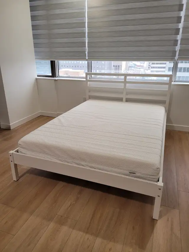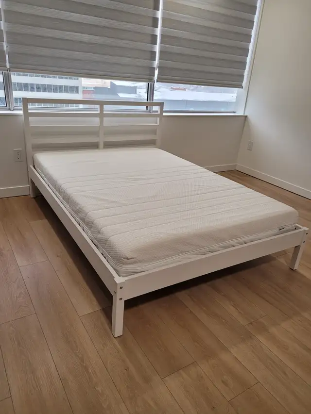 1) White IKEA TARVA twin bed frame AKREHAMN firm mattress. 105cm (42”) W x 199cm (79”) L x 32cm (12”) H. Headboard is 92cm (36”) high. $250