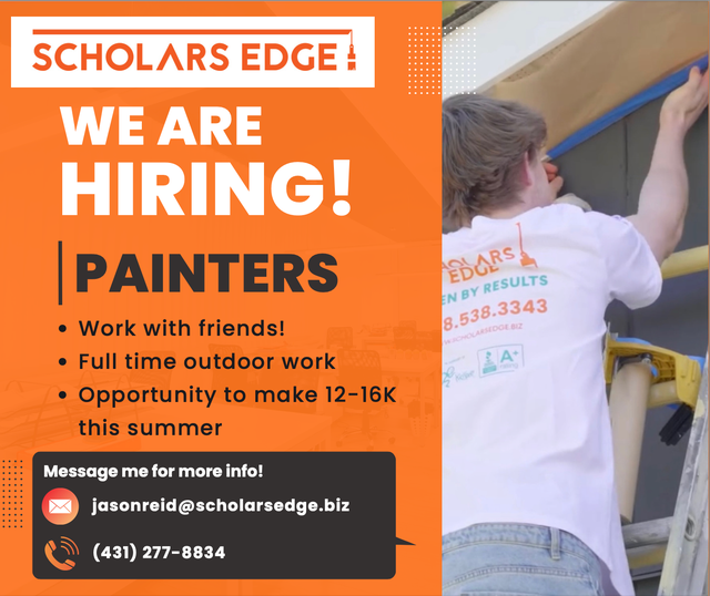 Are you looking for a rewarding summer job? Look no further! Scholars Edge Painting is hiring painters for the upcoming 2026 spring and summer season. This is the ideal position if you are interested in gaining new skills, making connections and earning great money during the summer months. We will primarily be working in the River Heights area.