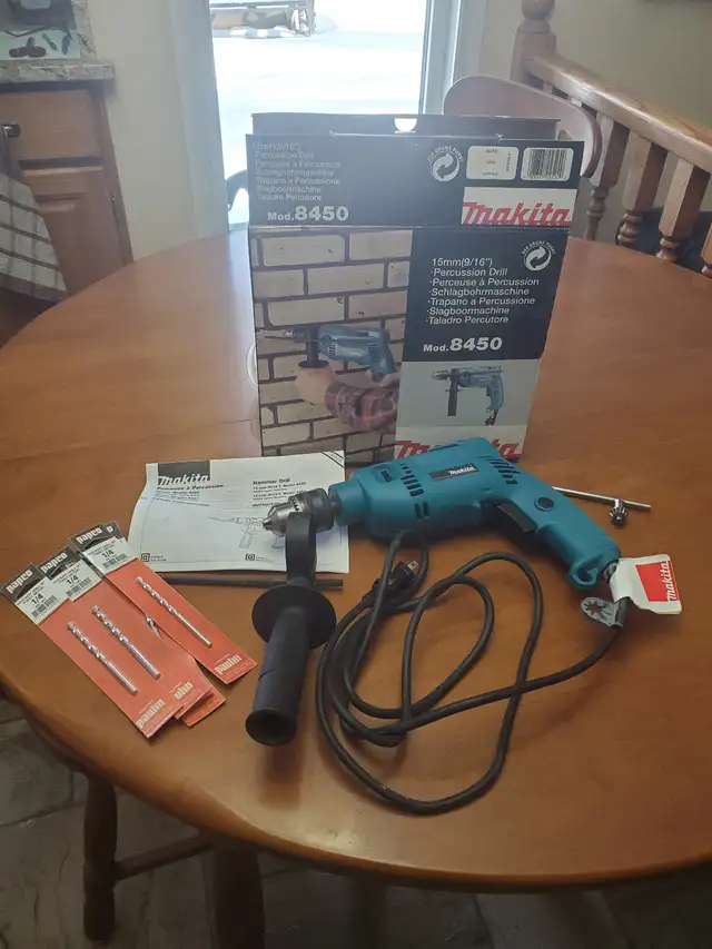 This is a corded Makita drill model 8450 only used on one home project. Very effective for heavy duty applications such as masonry & concrete work. The drill is variable speed and reversing. It comes with side grip, depth gauge and owner's manual and it's original box. Also included are 5 unopened 1/4 masonry bits. I live in SE Calgary (Deer Run) and can be reached at tsawdon@shaw.ca