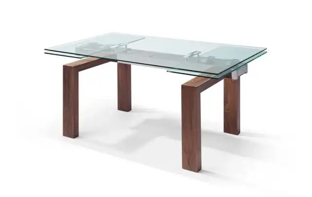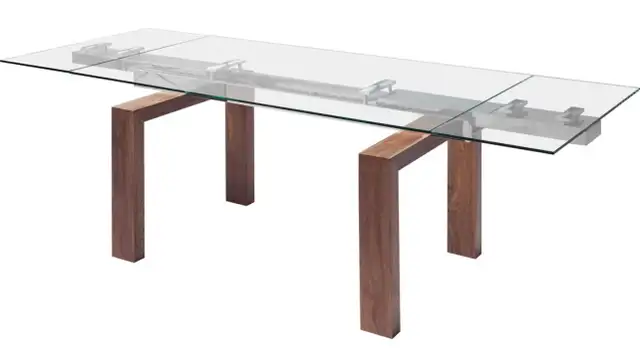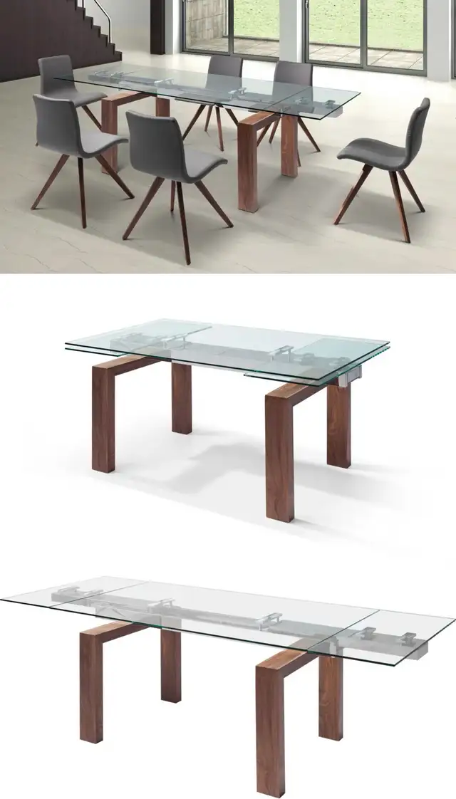 Add a touch of modern elegance to your dining space with this used glass dining table. The sleek glass top and sturdy wooden legs create a sophisticated look that complements any decor.