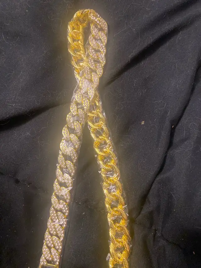 This is a gently used Cuban link chain that features a bold design with embedded stones, adding a touch of sparkle to its robust appearance. The chain presents a blend of gold and silver tones, making it a versatile accessory for various styles. It's in good condition, ready to enhance any outfit.