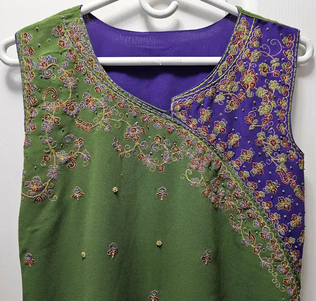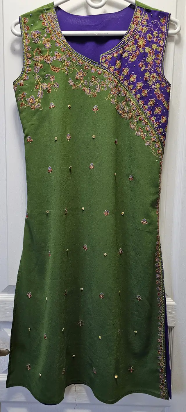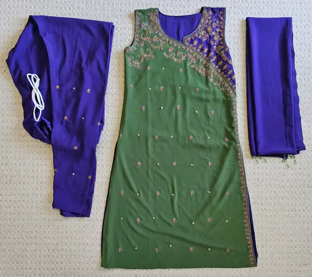 All 3 Pieces are made of Georgette fabric and include Green Top with Purple Neckline with embroidery (and purple inner lining) Purple Salwar and Purple Dupatta.