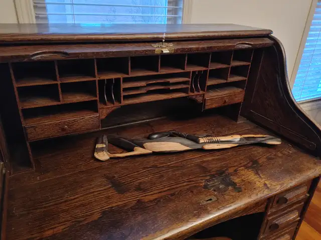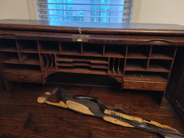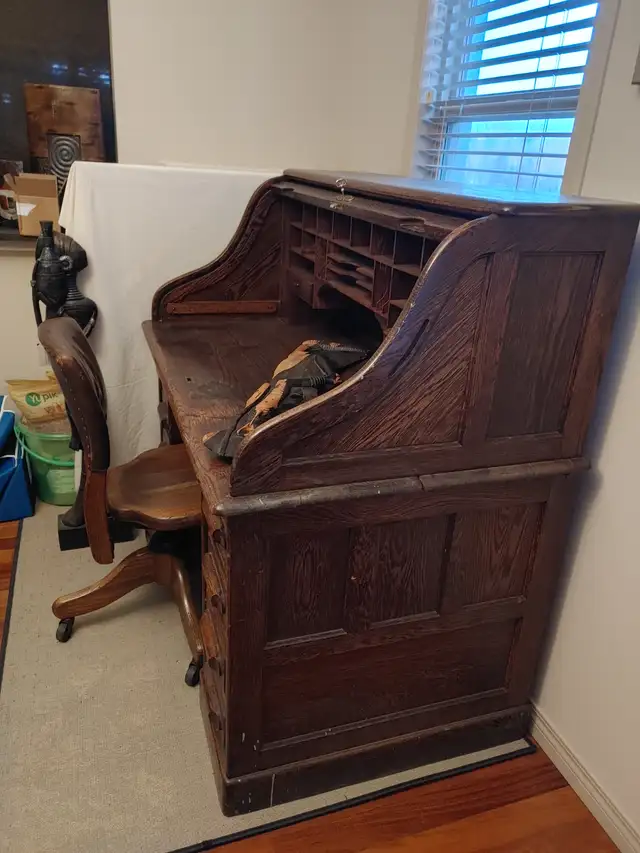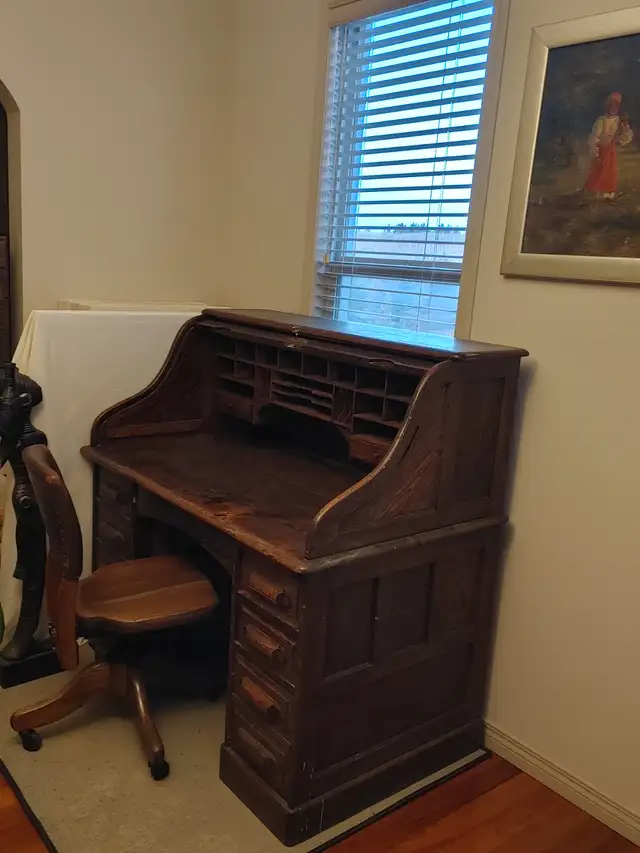 This is a beautiful antique from the 1900soak roll-top desk ,perfect for a home office. It is well preserved and features