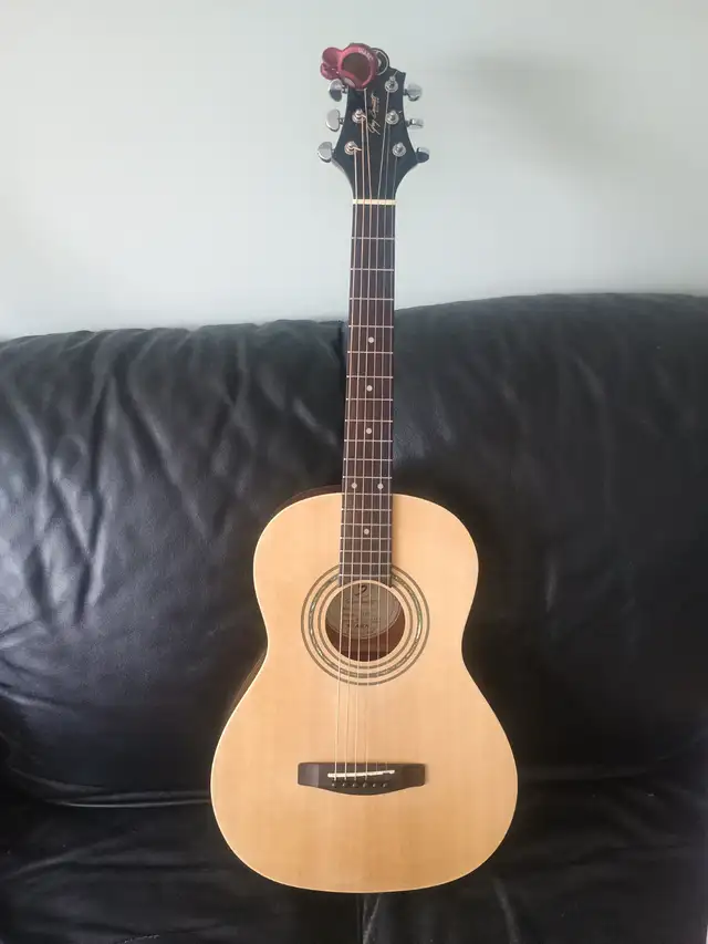 Greg Bennett 3/4 folk size guitar st62 abalone sound hole inlay Grover tuning heads Rosewood fingerboard solid spruce top quality instrument for someone with smaller hands or child brand new condition was never used with a padded case and snark tuner immaculate $160 call or text 416-285-0719 or email