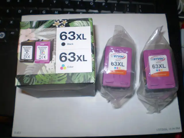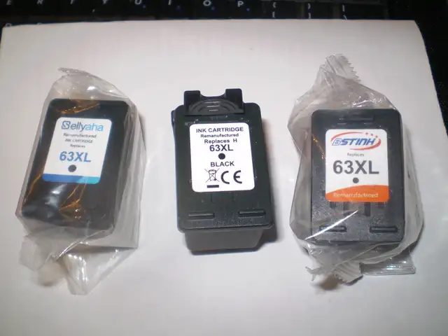 Aftermarket/Remanufactured HP 63XL cartridges. Bought out of Toronto for my Mom's old HP printer that the GEEK SQUAD deemed fit for e-trash. These will not fit the new printer compatible with Windows 10. Sealed in plastic or 1 set of two in a box. Unused. 10 cartridges in all -3 colour and 7 black. Single ones $10 each. Pair in box $20. 3 for $25 or the lot for $80